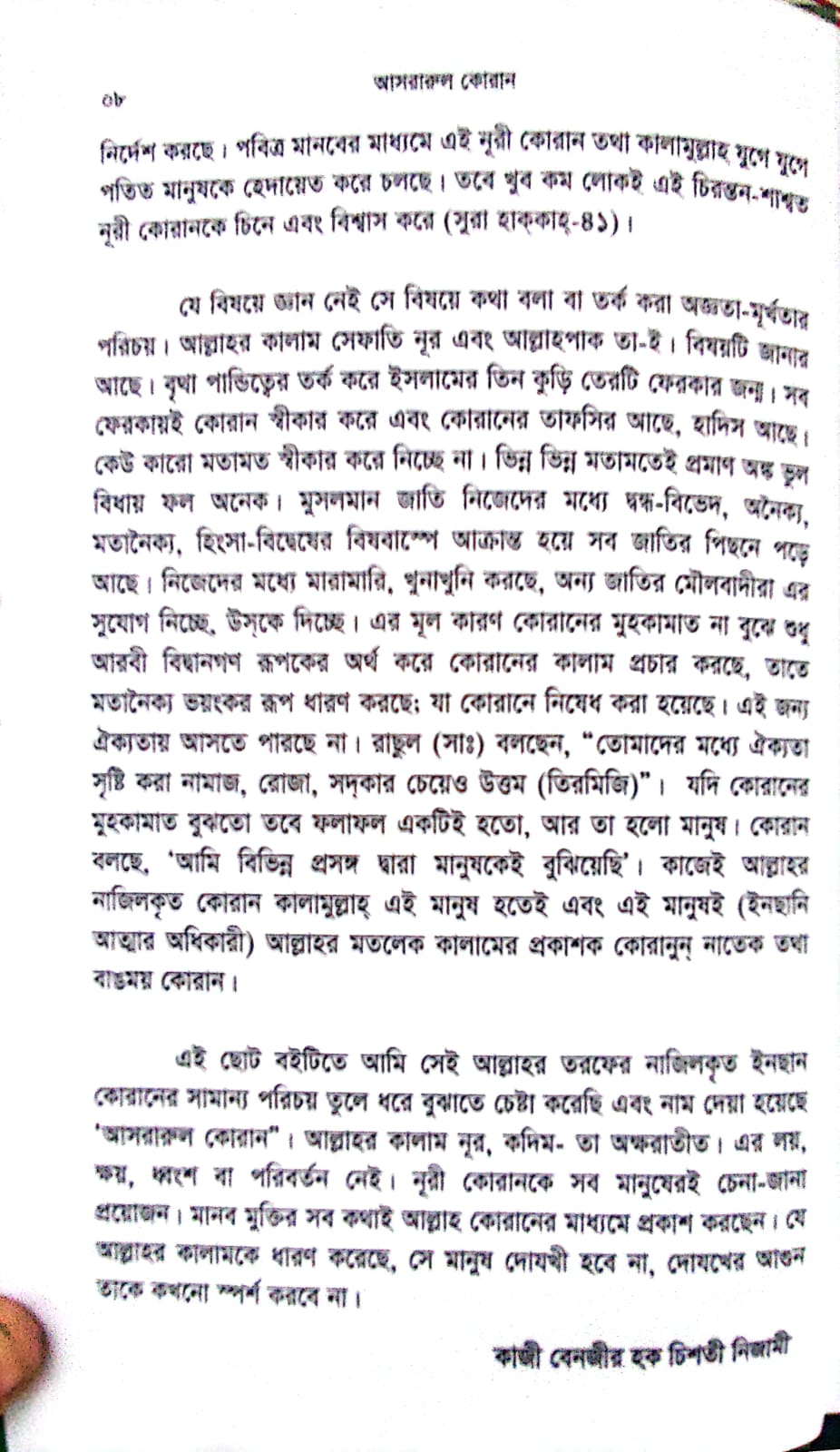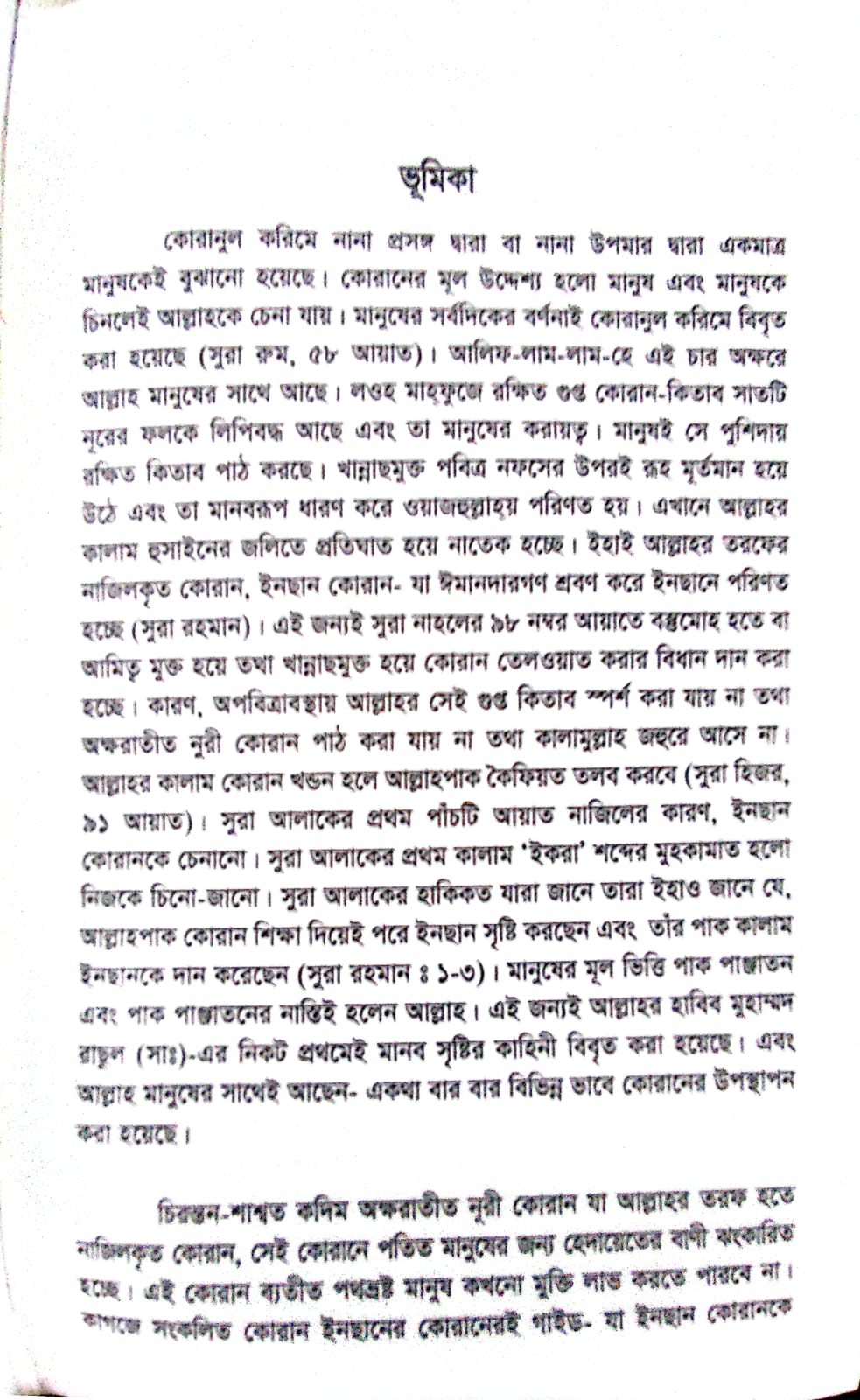 চিরন্তন-শাশ্বত কদিম অক্ষরাতীত নূরী কোরান যা আল্লাহর তরফ হতে নাজিলকৃত কোরান, সেই কোরানে পতিত মানুষের জন্য হেদায়েতের বাণী ঝংকারিত হচ্ছে। এই কোরান ব্যতীত পথভ্রষ্ট মানুষ কখনো মুক্তি লাভ করতে পারবে না। কাগজে সংকলিত কোরান ইনছানের কোরানেরই গাইড- যা ইনছান কোরানকে