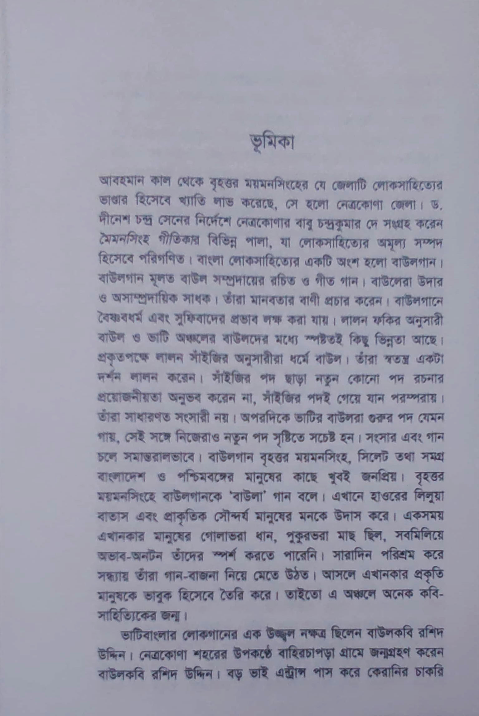 আবহমান কাল থেকে বৃহত্তর ময়মনসিংহের যে জেলাটি লোকসাহিত্যের ভাণ্ডার হিসেবে খ্যাতি লাভ করেছে, সে হলো নেত্রকোণা জেলা। ড. দীনেশ চন্দ্র সেনের নির্দেশে নেত্রকোণার বাবু চন্দ্রকুমার দে সংগ্রহ করেন মৈমনসিংহ গীতিকার বিভিন্ন পালা, যা লোকসাহিত্যের অমূল্য সম্পদ হিসেবে পরিগণিত। বাংলা লোকসাহিত্যের একটি অংশ হলো বাউলগান। বাউলগান মূলত বাউল সম্প্রদায়ের রচিত ও গীত গান। বাউলেরা উদার ও অসাম্প্রদায়িক সাধক। তাঁরা মানবতার বাণী প্রচার করেন। বাউলগানে বৈষ্ণবধর্ম এবং সুফিবাদের প্রভাব লক্ষ করা যায়। লালন ফকির অনুসারী বাউল ও ভাটি অঞ্চলের বাউলদের মধ্যে স্পষ্টতই কিছু ভিন্নতা আছে। প্রকৃতপক্ষে লালন সাঁইজির অনুসারীরা ধর্মে বাউল। তাঁরা স্বতন্ত্র একটা দর্শন লালন করেন। সাঁইজির পদ ছাড়া নতুন কোনো পদ রচনার প্রয়োজনীয়তা অনুভব করেন না, সাঁইজির পদই গেয়ে যান পরম্পরায়। তাঁরা সাধারণত সংসারী নয়। অপরদিকে ভাটির বাউলরা গুরুর পদ যেমন গায়, সেই সঙ্গে নিজেরাও নতুন পদ সৃষ্টিতে সচেষ্ট হন। সংসার এবং গান চলে সমান্তরালভাবে। বাউলগান বৃহত্তর ময়মনসিংহ, সিলেট তথা সমগ্র বাংলাদেশ ও পশ্চিমবঙ্গের মানুষের কাছে খুবই জনপ্রিয়। বৃহত্তর ময়মনসিংহে বাউলগানকে 'বাউলা' গান বলে। এখানে হাওরের লিলুয়া বাতাস এবং প্রাকৃতিক সৌন্দর্য মানুষের মনকে উদাস করে। একসময় এখানকার মানুষের গোলাভরা ধান, পুকুরভরা মাছ ছিল, সবমিলিয়ে অভাব-অনটন তাঁদের স্পর্শ করতে পারেনি। সারাদিন পরিশ্রম করে সন্ধ্যায় তাঁরা গান-বাজনা নিয়ে মেতে উঠত। আসলে এখানকার প্রকৃতি মানুষকে ভাবুক হিসেবে তৈরি করে। তাইতো এ অঞ্চলে অনেক কবি- সাহিত্যিকের জন্ম।