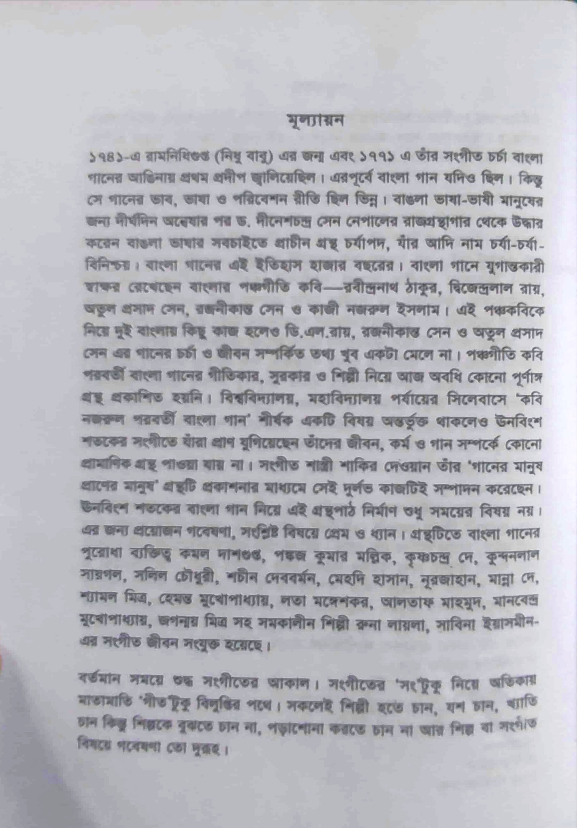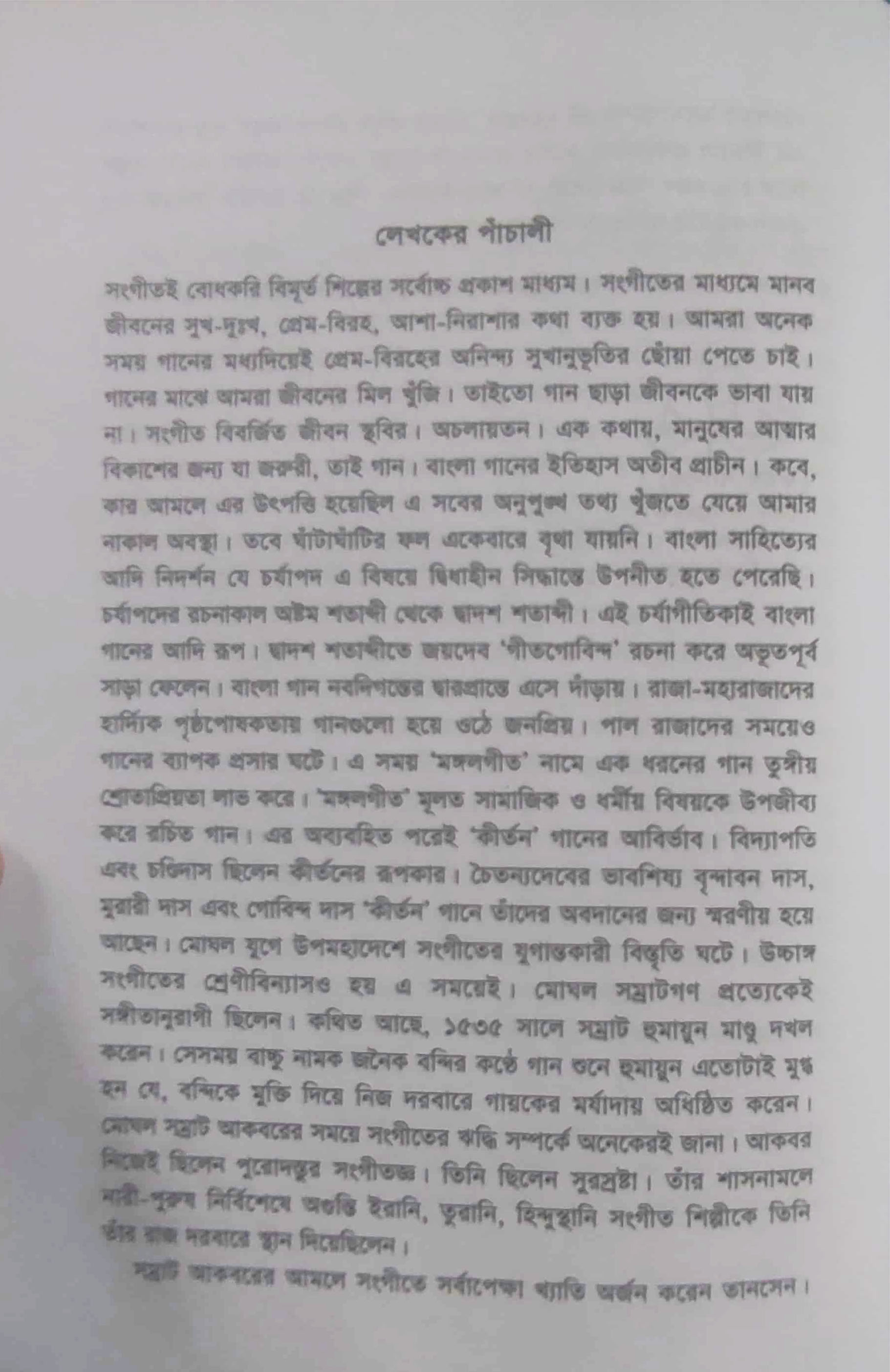 সংগীতই বোধকরি বিমূর্ত শিল্পের সর্বোচ্চ প্রকাশ মাধ্যম। সংগীতের মাধ্যমে মানব জীবনের সুখ-দুঃখ, প্রেম-বিরহ, আশা-নিরাশার কথা ব্যক্ত হয়। আমরা অনেক সময় গানের মধ্যদিয়েই প্রেম-বিরহের অনিন্দ্য সুখানুভূতির ছোঁয়া পেতে চাই। গানের মাঝে আমরা জীবনের মিল খুঁজি । তাইতো গান ছাড়া জীবনকে ভাবা যায় না। সংগীত বিবর্জিত জীবন স্থবির। অচলায়তন। এক কথায়, মানুষের আত্মার বিকাশের জন্য যা জরুরী, তাই গান। বাংলা গানের ইতিহাস অতীব প্রাচীন। কবে, কার আমলে এর উৎপত্তি হয়েছিল এ সবের অনুপুঙ্খ তথ্য খুঁজতে যেয়ে আমার নাকাল অবস্থা। তবে ঘাঁটাঘাঁটির ফল একেবারে বৃথা যায়নি। বাংলা সাহিত্যের আদি নিদর্শন যে চর্যাপদ এ বিষয়ে দ্বিধাহীন সিদ্ধান্তে উপনীত হতে পেরেছি। চর্যাপদের রচনাকাল অষ্টম শতাব্দী থেকে দ্বাদশ শতাব্দী। এই চর্যাগীতিকাই বাংলা গানের আদি রূপ। দ্বাদশ শতাব্দীতে জয়দেব 'গীতগোবিন্দ' রচনা করে অভূতপূর্ব সাড়া ফেলেন । বাংলা গান নবদিগন্তের দ্বারপ্রান্তে এসে দাঁড়ায়। রাজা-মহারাজাদের হার্দিক পৃষ্ঠপোষকতায় গানগুলো হয়ে ওঠে জনপ্রিয়। পাল রাজাদের সময়েও গানের ব্যাপক প্রসার ঘটে। এ সময় ‘মঙ্গলগীত' নামে এক ধরনের গান তুঙ্গীয় শ্রোতাপ্রিয়তা লাভ করে । 'মঙ্গলগীত' মূলত সামাজিক ও ধর্মীয় বিষয়কে উপজীব্য করে রচিত গান। এর অব্যবহিত পরেই 'কীর্তন' গানের আবির্ভাব। বিদ্যাপতি এবং চণ্ডিদাস ছিলেন কীর্তনের রূপকার। চৈতন্যদেবের ভাবশিষ্য বৃন্দাবন দাস, মুরারী দাস এবং গোবিন্দ দাস 'কীর্তন' গানে তাদের অবদানের জন্য স্মরণীয় হয়ে আছেন। মোঘল যুগে উপমহাদেশে সংগীতের যুগান্তকারী বিস্তৃতি ঘটে। উচ্চাঙ্গ সংগীতের শ্রেণীবিন্যাসও হয় এ সময়েই। মোঘল সম্রাটগণ প্রত্যেকেই সঙ্গীতানুরাগী ছিলেন। কথিত আছে, ১৫৩৫ সালে সম্রাট হুমায়ুন মাণ্ডু দখল করেন। সেসময় বাচ্চু নামক জনৈক বন্দির কণ্ঠে গান শুনে হুমায়ুন এতোটাই মুগ্ধ হন যে, বন্দিকে মুক্তি দিয়ে নিজ দরবারে গায়কের মর্যাদায় অধিষ্ঠিত করেন। মোঘল সম্রাট আকবরের সময়ে সংগীতের ঋদ্ধি সম্পর্কে অনেকেরই জানা । আকবর নিজেই ছিলেন পুরোদস্তুর সংগীতজ্ঞ। তিনি ছিলেন সুরস্রষ্টা। তাঁর শাসনামলে নারী-পুরুষ নির্বিশেষে অগুন্তি ইরানি, তুরানি, হিন্দুস্থানি সংগীত শিল্পীকে তিনি তাঁর রাজ দরবারে স্থান দিয়েছিলেন।