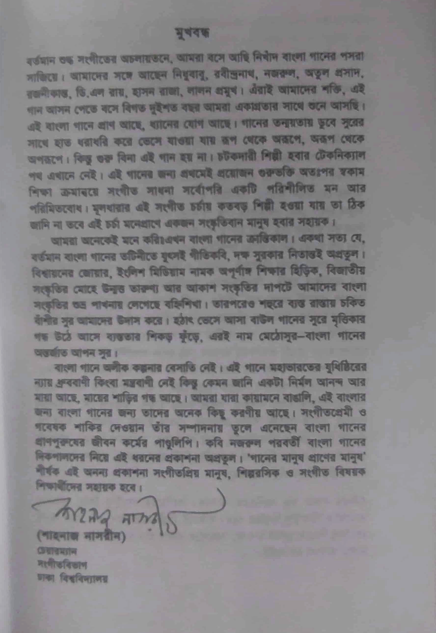 বাংলা গানে অলীক কল্পনার বেসাতি নেই। এই গানে মহাভারতের যুধিষ্ঠিরের ন্যায় ধ্রুববাণী কিংবা মন্ত্রবাণী নেই কিন্তু কেমন জানি একটা নির্মল আনন্দ আর মায়া আছে, মায়ের শাড়ির গন্ধ আছে। আমরা যারা কায়ামনে বাঙালি, এই বাংলার জন্য বাংলা গানের জন্য তাদের অনেক কিছু করণীয় আছে। সংগীতপ্রেমী ও গবেষক শাকির দেওয়ান তাঁর সম্পাদনায় তুলে এনেছেন বাংলা গানের প্রাণপুরুষের জীবন কর্মের পাণ্ডুলিপি। কবি নজরুল পরবর্তী বাংলা গানের দিকপালদের নিয়ে এই ধরনের প্রকাশনা অপ্রতুল। 'গানের মানুষ প্রাণের মানুষ' শীর্ষক এই অনন্য প্রকাশনা সংগীতপ্রিয় মানুষ, শিল্পরসিক ও সংগীত বিষয়ক শিক্ষার্থীদের সহায়ক হবে।
