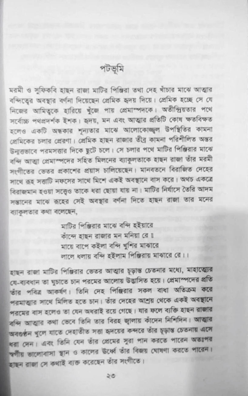 মরমী ও সুফিকবি হাছন রাজা মাটির পিঞ্জিরা তথা দেহ খাঁচার মাঝে আত্মার বন্দিত্বের অবস্থার বর্ণনা দিয়েছেন প্রেমিক হৃদয় দিয়ে। প্রেমিক হচ্ছে সে যে নিজের আমিত্বকে হারিয়ে খুঁজে পায় প্রেমাস্পদকে। অতীন্দ্রিয়তার পথে সর্বোচ্চ পথপ্রদর্শক ইশক। হৃদয়, মন এবং আত্মার প্রতিটি কোষ ক্ষতবিক্ষত হলেও একটি অন্ধকার শূন্যতার মাঝে আলোকোজ্জ্বল উপস্থিতির কামনা প্রেমিকের চলার প্রেরণা। প্রেমিক হাছন রাজার তীব্র কামনা পরিশীলিত অন্তর উন্মত্তভাবে পরমসত্তার দিকে ছুটে চলে। সে চলার পথে মাটির পিঞ্জিরার মাঝে বন্দি আত্মা প্রেমাস্পদের সহিত মিলনের ব্যাকুলতাকে হাছন রাজা তাঁর মরমী সংগীতের ভেতর প্রকাশের প্রয়াস চালিয়েছেন। মানবর্তনে বিরাজিত দেহের সাথে রূহ সত্তাটি নফসের সাথে মিশে একই অবস্থানে বাস করে। অথচ একত্রে বিরাজমান হওয়া সত্ত্বেও তাকে ধরা ছোয়া যায় না। মাটির নির্যাসে তৈরি আদম সন্তানের মাঝে রূহের সেই অবস্থার বর্ণনা দিতে হাছন রাজা তার মনের ব্যাকুলতার কথা বলেছেন,