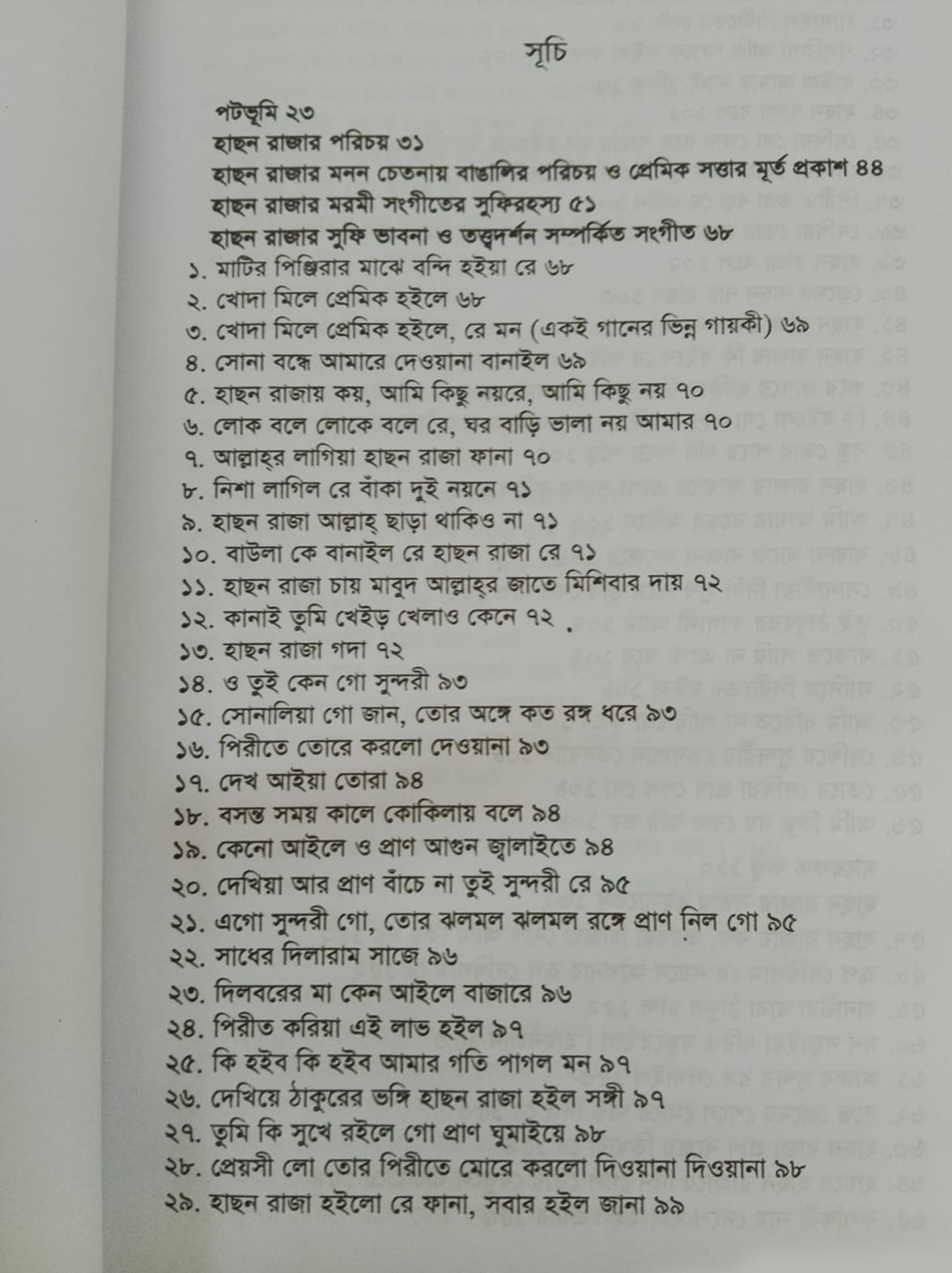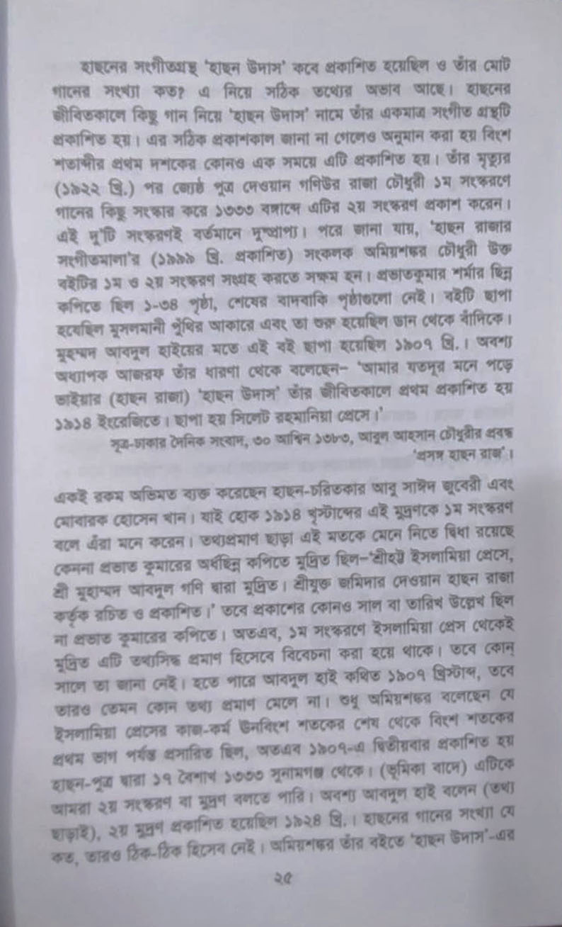 সূত্র-ঢাকার দৈনিক সংবাদ, ৩০ আশ্বিন ১৩৮৩, আবুল আহসান চৌধুরীর প্রবন্ধ 'প্রসঙ্গ হাছন রাজ একই রকম অভিমত ব্যক্ত করেছেন হাছন-চরিতকার আবু সাঈদ জুবেরী এবং মোবারক হোসেন খান। যাই হোক ১৯১৪ খৃস্টাব্দের এই মুদ্রণকে ১ম সংস্করণ বলে এঁরা মনে করেন। তথ্যপ্রমাণ ছাড়া এই মতকে মেনে নিতে দ্বিধা রয়েছে। কেননা প্রভাত কুমারের অর্ধাছিন্ন কপিতে মুদ্রিত ছিল-'শ্রীহট্ট ইসলামিয়া প্রেসে, শ্ৰী মুহাম্মদ আবদুল গণি দ্বারা মুদ্রিত। শ্রীযুক্ত জমিদার দেওয়ান হাছন রাজা কর্তৃক রচিত ও প্রকাশিত। তবে প্রকাশের কোনও সাল বা তারিখ উল্লেখ ছিল না প্রভাত কুমারের কপিতে। অতএব, ১ম সংস্করণে ইসলামিয়া প্রেস থেকেই মুদ্রিত এটি তথ্যসিদ্ধ প্রমাণ হিসেবে বিবেচনা করা হয়ে থাকে। তবে কোন্ সালে তা জানা নেই। হতে পারে আবদুল হাই কথিত ১৯০৭ খ্রিস্টাব্দ, তবে তারও তেমন কোন তথ্য প্রমাণ মেলে না। শুধু অমিয়শঙ্কর বলেছেন যে ইসলামিয়া প্রেসের কাজ-কর্ম ঊনবিংশ শতকের শেষ থেকে বিংশ শতকের প্রথম ভাগ পর্যন্ত প্রসারিত ছিল, অতএব ১৯০৭-এ দ্বিতীয়বার প্রকাশিত হয় হাছন-পুত্র দ্বারা ১৭ বৈশাখ ১৩৩৩ সুনামগঞ্জ থেকে। (ভূমিকা বাদে) এটিকে আমরা ২য় সংস্করণ বা মুদ্রণ বলতে পারি। অবশ্য আবদুল হাই বলেন (তথ্য ছাড়াই), ২য় মুদ্রণ প্রকাশিত হয়েছিল ১৯২৪ খ্রি.। হাছনের গানের সংখ্যা যে কত, তারও ঠিক-ঠিক হিসেব নেই। অমিয়শঙ্কর তাঁর বইতে 'হাছন উদাস'-এর