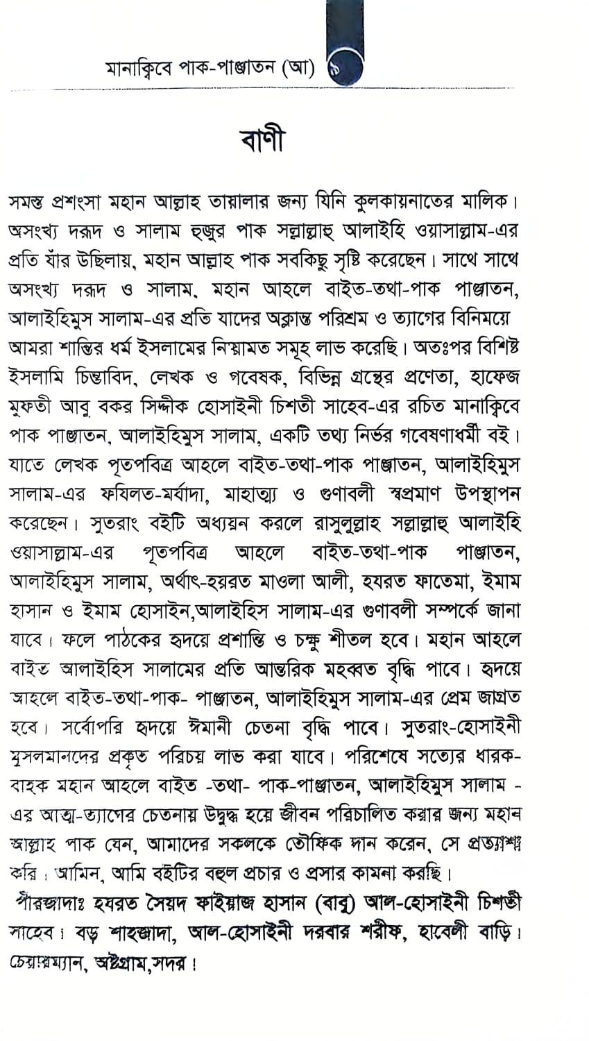 সমস্ত প্রশংসা মহান আল্লাহ তায়ালার জন্য যিনি কুলকায়নাতের মালিক। অসংখ্য দরূদ ও সালাম হুজুর পাক সল্লাল্লাহু আলাইহি ওয়াসাল্লাম-এর প্রতি যার উছিলায়, মহান আল্লাহ পাক সবকিছু সৃষ্টি করেছেন । সাথে সাথে অসংখ্য দরূদ ও সালাম, মহান আহলে বাইত-তথা-পাক পাঞ্জাতন, আলাইহিমুস সালাম-এর প্রতি যাদের অক্লান্ত পরিশ্রম ও ত্যাগের বিনিময়ে আমরা শান্তির ধর্ম ইসলামের নিয়ামত সমূহ লাভ করেছি। অতঃপর বিশিষ্ট ইসলামি চিন্তাবিদ, লেখক ও গবেষক, বিভিন্ন গ্রন্থের প্রণেতা, হাফেজ মুফতী আবু বকর সিদ্দীক হোসাইনী চিশতী সাহেব-এর রচিত মানাকিবে পাক পাঞ্জাতন, আলাইহিমুস সালাম, একটি তথ্য নির্ভর গবেষণাধর্মী বই । যাতে লেখক পূতপবিত্র আহলে বাইত-তথা-পাক পাঞ্জাতন, আলাইহিমুস সালাম-এর ফযিলত-মর্যাদা, মাহাত্ম্য ও গুণাবলী স্বপ্রমাণ উপস্থাপন করেছেন। সুতরাং বইটি অধ্যয়ন করলে রাসুলুল্লাহ সল্লাল্লাহু আলাইহি ওয়াসাল্লাম-এর পূতপবিত্ৰ আহলে বাইত-তথা-পাক পাঞ্জাতন, আলাইহিমুস সালাম, অর্থাৎ-হয়রত মাওলা আলী, হযরত ফাতেমা, ইমাম হাসান ও ইমাম হোসাইন,আলাইহিস সালাম-এর গুণাবলী সম্পর্কে জানা যাবে। ফলে পাঠকের হৃদয়ে প্রশান্তি ও চক্ষু শীতল হবে। মহান আহলে বাইত আলাইহিস সালামের প্রতি আন্তরিক মহব্বত বৃদ্ধি পাবে। হৃদয়ে আহলে বাইত-তথা-পাক- পাঞ্জাতন, আলাইহিমুস সালাম-এর প্রেম জাগ্রত হবে। সর্বোপরি হৃদয়ে ঈমানী চেতনা বৃদ্ধি পাবে। সুতরাং-হোসাইনী মুসলমানদের প্রকৃত পরিচয় লাভ করা যাবে। পরিশেষে সত্যের ধারক- বাহক মহান আহলে বাইত -তথা- পাক-পাঞ্জাতন, আলাইহিমুস সালাম এর আত্ম-ত্যাগের চেতনায় উদ্বুদ্ধ হয়ে জীবন পরিচালিত করার জন্য মহান জাল্লাহ পাক যেন, আমাদের সকলকে তৌফিক দান করেন, সে প্রত্যাশা করি ৷ জামিন, আমি বইটির বহুল প্রচার ও প্রসার কামনা করছি । পীরজাদাঃ হযরত সৈয়দ ফাইয়াজ হাসান (বাবু) আল-হোসাইনী চিশী সাহেব। বড় শাহজাদা, আল-হোসাইনী দরবার শরীফ, হাবেলী বাড়ি । চেয়ারম্যান, অষ্টগ্রাম,সদর !