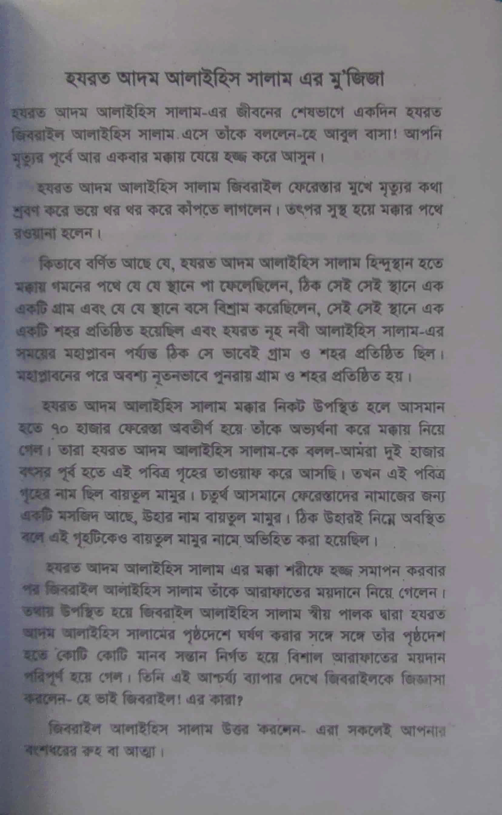 কিতাবে বর্ণিত আছে যে, হযরত আদম আলাইহিস সালাম হিন্দুস্থান হতে মক্কায় গমনের পথে যে যে স্থানে পা ফেলেছিলেন, ঠিক সেই সেই স্থানে এক একটি গ্রাম এবং যে যে স্থানে বসে বিশ্রাম করেছিলেন, সেই সেই স্থানে এক একটি শহর প্রতিষ্ঠিত হয়েছিল এবং হযরত নূহ নবী আলাইহিস সালাম-এর সময়ের মহাপ্লাবন পর্যন্ত ঠিক সে ভাবেই গ্রাম ও শহর প্রতিষ্ঠিত ছিল। মহাপ্লাবনের পরে অবশ্য নূতনভাবে পুনরায় গ্রাম ও শহর প্রতিষ্ঠিত হয় ।