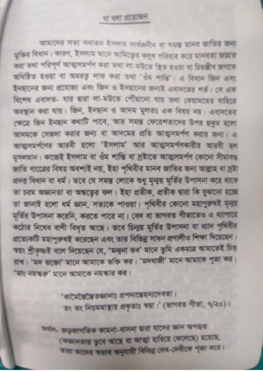 আমাদের সত্য সনাতন ইসলাম সার্বজনীন বা সমস্ত মানব জাতির জন্য মুক্তির বিধান। কারণ, ইসলাম মানে আমিত্বের কলুষ পরিহার করে মানবতা জাগ্রত করা তথা পরিপূর্ণ আত্মসমর্পণ করা তথা লা-মউতে স্থিত হওয়া বা চিরঞ্জীব জগতে অধিষ্ঠিত হওয়া বা অমরত্ব লাভ করা তথা ওঁম শান্তি। এ বিধান জিন এবং ইনছানের জন্য প্রযোজ্য এবং জিন ও ইনছানের জন্যই এবাদতের শর্ত। সে এক বিশেষ এবাদত- যার দ্বারা লা-মউতে পৌঁছানো যায় তথা কেয়ামতের বাহিরে অবস্থান করা যায়। জিন, ইনছান ও আদম মূলতঃ এক বিষয় নয়। এবাদতের ক্ষেত্রে জিন ইনছান কথাটি পাবে, আর সমস্ত ফেরেশতাদের উপর হুকুম হলো আদমকে সেজদা করার জন্য বা আদমের প্রতি আত্মসমর্পণ করার জন্য। এ আত্মসমর্পণের আরবী হলো 'ইসলাম' আর আত্মসমর্পণকারীর আরবী হল মুসলমান। কাজেই ইসলাম বা ওঁম শান্তি বা স্রষ্টাতে আত্মসমর্পণ কোনো সীমাবদ্ধ জাতি গাত্রের বিষয় অবশ্যই নয়, ইহা পৃথিবীর মানব জাতির জন্য আল্লাহ বা স্রষ্টা প্রদত্ত বিধান বা ধর্ম। তবে যে সমস্ত লোকে শুধু মৃন্ময় মূর্তির উপাসনা করে থাকে তা চরম অজ্ঞানতা বা অন্ধত্বের ফল। ইহা প্রতীক, প্রতীক দ্বারা কি বুঝানো হচ্ছে তা জানাই হলো ধর্ম জ্ঞান, সত্যকে পাওয়া। পৃথিবীর কোনো মহাপুরুষই মৃন্ময় মূর্তির উপাসনা করেনি, করতে পারে না। বেদ বা ভাগবত গীতাতেও এ ব্যাপারে কঠোর নিষেধ বাণী বিধৃত আছে। তবে চিন্ময় মূর্তির উপাসনা বা ধ্যান পৃথিবীর প্রত্যেকটি মহাপুরুষই করেছেন এবং তার বিভিন্ন সাধন প্রণালীও শিক্ষা দিয়েছেন। স্বয়ং শ্রীকৃষ্ণই বলে দিয়েছেন যে, 'মন্মনা ভব' মানে তুমি একমাত্র আমাতেই চিত্ত রাখ। 'মদ ভক্তো' মানে আমাকে ভক্তি কর। 'মদযাজী' মানে আমাকে পূজা কর। "মাং নমস্করু' মানে আমাকে নমস্কার কর ।
