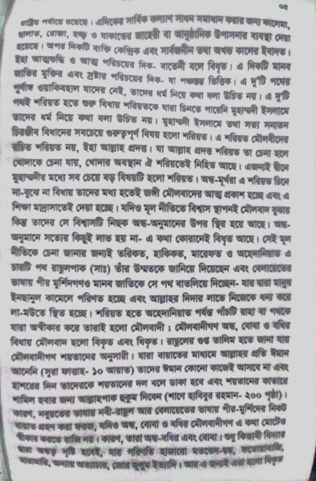 রাষ্ট্রিয় পর্যায়ে রয়েছে । এদিকের সার্বিক কল্যাণ সাধন সমাধান করার জন্য কালেমা, ছালাত, রোজা, হজ্জ্ব ও যাকাতের জাহেরী বা আনুষ্ঠানিক উপাসনার ব্যবস্থা দেয়া হয়েছে। অপর দিকটি ব্যক্তি কেন্দ্রিক এবং সার্বজনীন তথা অখন্ড কালের ইবাদত। ইহা আত্মশুদ্ধি ও আত্ম পরিচয়ের দিক- বাতেনী বলে বিধৃত। এ দিকটি মানব জাতির মুক্তির এবং স্রষ্টার পরিচয়ের দিক- যা পঞ্চস্তম্ভ ভিত্তিক। এ দু'টি পথের পূর্ণাঙ্গ ওয়াকিবহাল যাদের নেই, তাদের ধর্ম নিয়ে কথা বলা উচিত নয়। এ দুটি পথই শরিয়ত হতে শুরু বিধায় শরিয়তকে যারা চিনতে পারেনি মুহাম্মদী ইসলামে তাদের ধর্ম নিয়ে কথা বলা উচিত নয়। মুহাম্মদী ইসলামে তথা সত্য সনাতন চিরঞ্জীব বিধানের সবচেয়ে গুরুত্বপূর্ণ বিষয় হলো শরিয়ত। এ শরিয়ত মৌলবীদের রচিত শরিয়ত নয়, ইহা আল্লাহ প্রদত্ত। যা আল্লাহ প্রদত্ত শরিয়ত তা চেনা হলে খোদাকে চেনা যায়, খোদার অবস্থান ঐ শরিয়তেই নিহিত আছে। এজন্যই বীনে মুহাম্মদীর মধ্যে সব চেয়ে বড় বিষয়টি হলো শরিয়ত । অন্ধ-মূর্খরা এ শরিয়ত চিনে না-বুঝে না বিধায় তাদের মধ্য হতেই জঙ্গী মৌলবাদের আত্ম প্রকাশ হচ্ছে এবং এ শিক্ষা মাদ্রাসাতেই দেয়া হচ্ছে। যদিও মূল নীতিতে বিশ্বাস স্থাপনই মৌলবাদ বুঝায় কিন্তু তাদের সে বিশ্বাসটি নিছক অন্ধ-অনুমানের উপর স্থির হয়ে আছে। অন্ধ- অনুমানে সত্যের কিছুই লাভ হয় না- এ কথা কোৱানেই বিধৃত আছে। সেই মূল নীতিকে চেনা জানার জন্যই তরিকত, হাকিকত, মারেফত ও অহেদানিয়াত এ চারটি পথ রাছুলপাক (সাঃ) তাঁর উম্মতকে জানিয়ে দিয়েছেন এবং বেলায়েতের ভাষায় পীর মুর্শিদগণও মানব জাতিকে সে পথ বাতলিয়ে দিচ্ছেন- যার দ্বারা মানুষ ইনছানুল কামেলে পরিণত হচ্ছে এবং আল্লাহর দিদার লাভে নিজেকে ধন্য করে লা-মউতে স্থিত হচ্ছে। শরিয়ত হতে অহেদানিয়াত পর্যন্ত পাঁচটি রাহা বা পথকে যারা অস্বীকার করে তারাই হলো মৌলবাদী । মৌলবাদীগণ অন্ধ, বোবা ও বধির বিধায় মৌলবাদ হলো বিকৃত এবং থিকৃত। রাহুলের গুপ্ত তালিম হতে জানা যায় মৌলবাদীগণ শয়তানের অনুসারী। যারা বায়াতের মাধ্যমে আল্লাহর প্রতি ঈমান আনেনি (সুরা ফাত্তাহ- ১০ আয়াত) তাদের ঈমান কোনো কাজেই আসবে না এবং হাশরের দিন তাদেরকে শয়তানের দল বলে ডাকা হবে এবং শয়তানের কাতারে শামিল হবার জন্য আল্লাহপাক হুকুম দিবেন (শানে হাবিবুর রহমান- ২০০ পৃষ্ঠা)। কারণ, নবুয়তের ভাষায় নবী-রাফুল আর বেলায়েতের ভাষায় পীর-মুর্শিদের নিকট বায়াত গ্রহণ করা ফরজ, যদিও অন্ধ, বোবা ও বধির মৌলবাদীগণ এ কথা মোটেও স্বীকার করতে রাজি নয়। কারণ, তারা অঙ্ক-বধির এবং বোবা। শুধু কিভাবী বিদ্যার যারা অন্ধত্ব সৃষ্টি হবেই, যার পরিণতি হাজারো মতভেদ-বন্ধ, ফতোয়াবাজি, মারামারি, অন্যায় অত্যাচার, জোর জুলুম ইত্যাদি। আর এ জন্যই এরা হলো বিকৃত