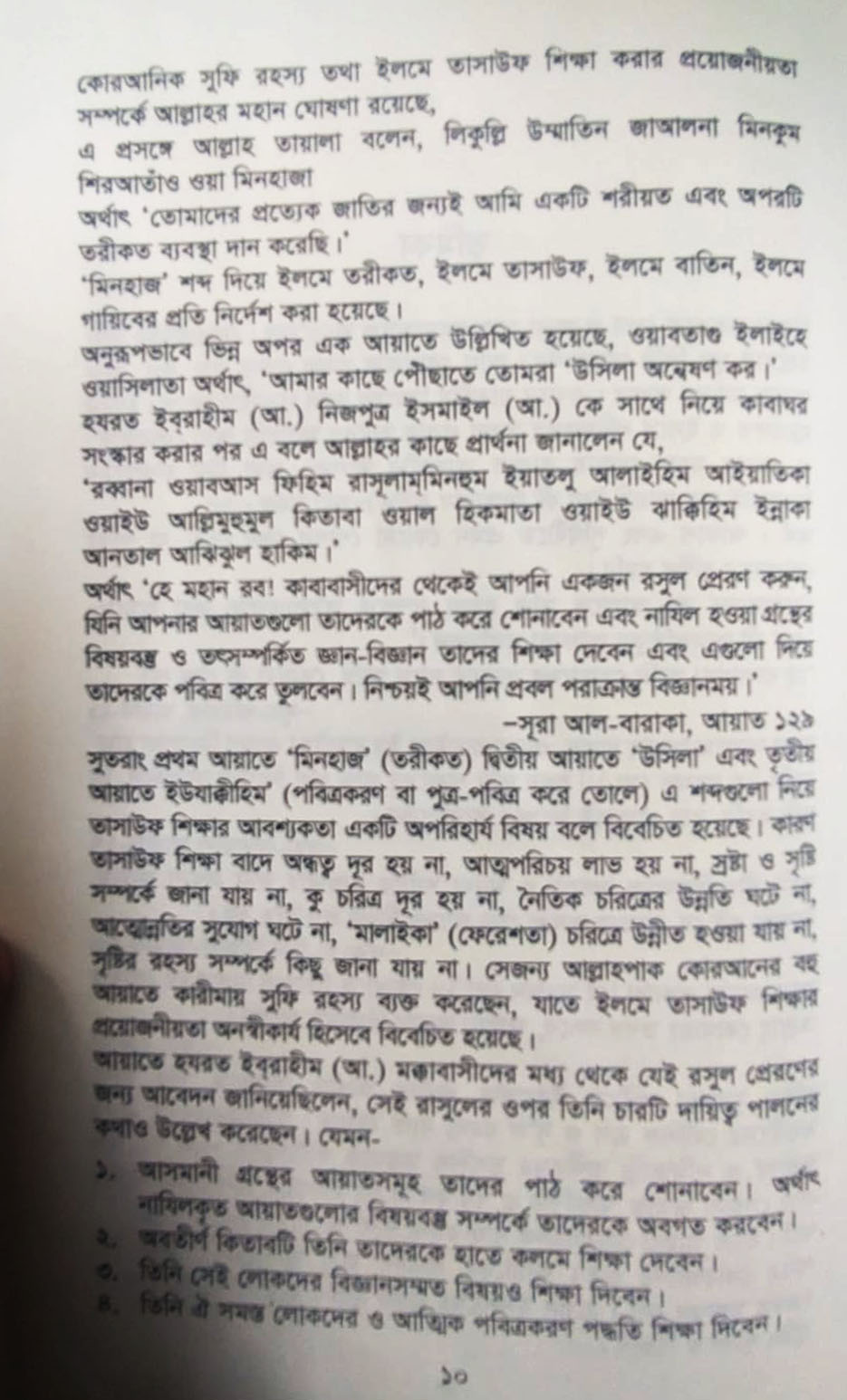 -সূরা আল-বারাকা, আয়াত ১২৯ সুতরাং প্রথম আয়াতে “মিনহাজ (তরীকত) দ্বিতীয় আয়াতে ‘উসিলা’ এবং তৃতীয় আয়াতে ইউযাক্কীহিম' (পবিত্রকরণ বা পুত্র-পবিত্র করে তোলে) এ শব্দগুলো নিয়ে তাসাউফ শিক্ষার আবশ্যকতা একটি অপরিহার্য বিষয় বলে বিবেচিত হয়েছে। কারণ তাসাউফ শিক্ষা বাদে অন্ধত্ব দূর হয় না, আত্মপরিচয় লাভ হয় না, স্রষ্টা ও সৃষ্টি সম্পর্কে জানা যায় না, কু চরিত্র দূর হয় না, নৈতিক চরিত্রের উন্নতি ঘটে না, আত্মোন্নতির সুযোগ ঘটে না, 'মালাইকা' (ফেরেশতা) চরিত্রে উন্নীত হওয়া যায় না, সৃষ্টির রহস্য সম্পর্কে কিছু জানা যায় না। সেজন্য আল্লাহপাক কোরআনের বহু আয়াতে কারীমায় সুফি রহস্য ব্যক্ত করেছেন, যাতে ইলমে তাসাউফ শিক্ষার প্রয়োজনীয়তা অনস্বীকার্য হিসেবে বিবেচিত হয়েছে।