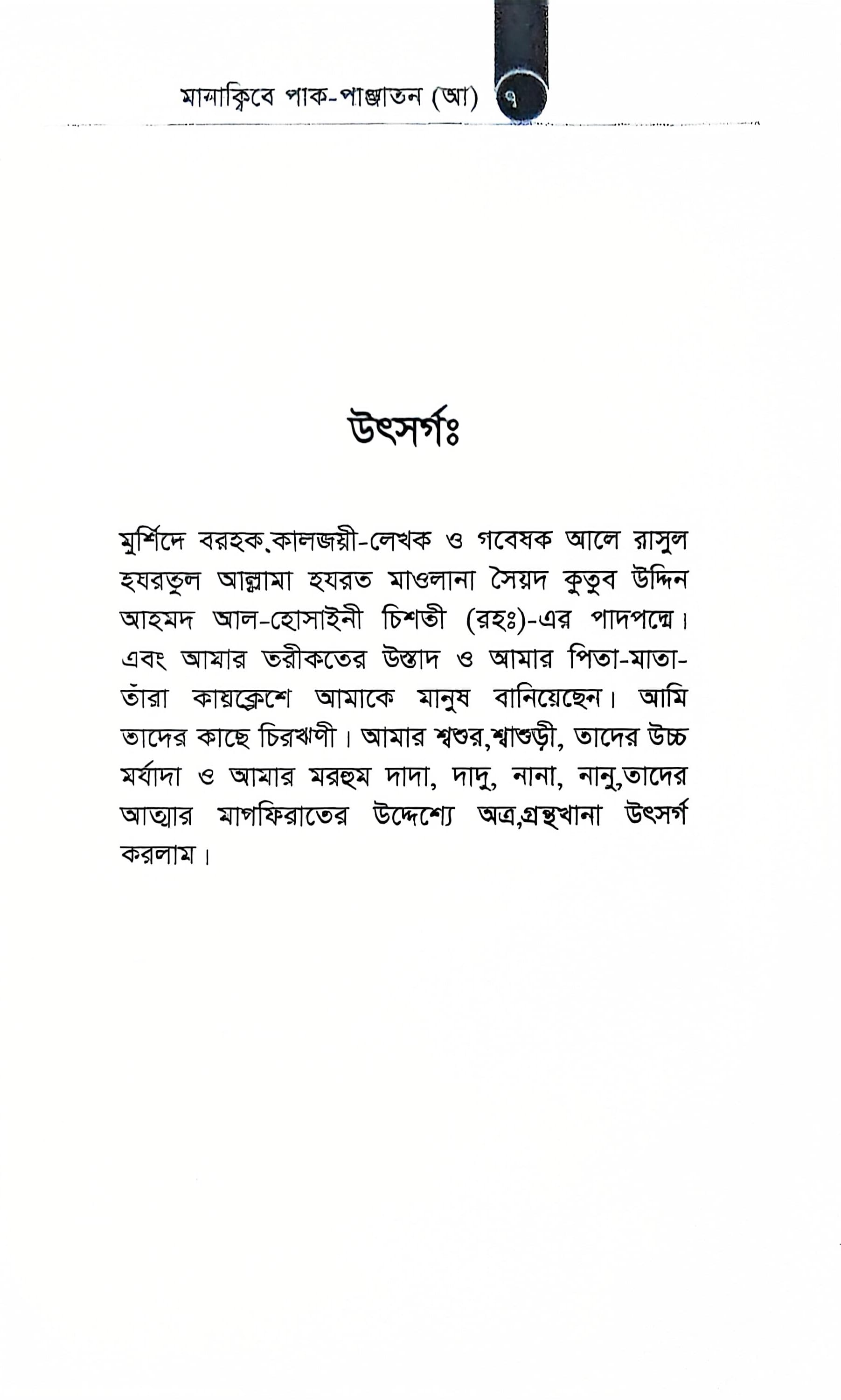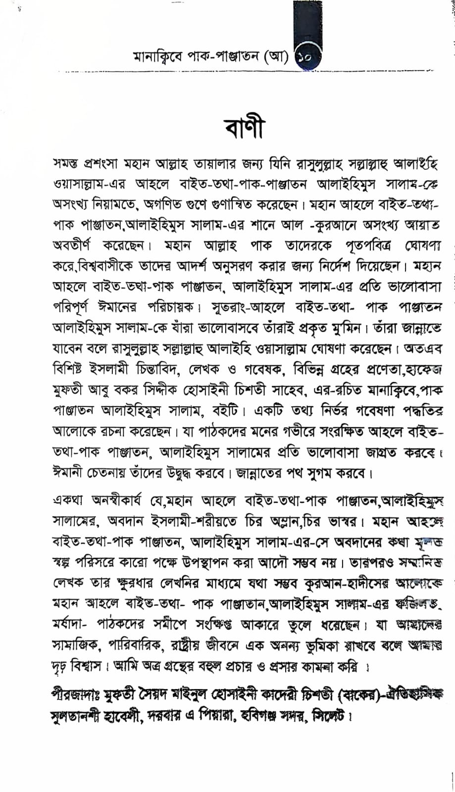 সমস্ত প্রশংসা মহান আল্লাহ তায়ালার জন্য যিনি রাসুলুল্লাহ সল্লাল্লাহু আলাইছি ওয়াসাল্লাম-এর আহলে বাইত-তথা-পাক-পাঞ্জাতন আলাইহিমুস সালাম-এ অসংখ্য নিয়ামতে, অগণিত গুণে গুণান্বিত করেছেন। মহান আহলে বাইত-তথা- পাক পাঞ্জাতন,আলাইহিমুস সালাম-এর শানে আল কুরআনে অসংখ্য আয়াত অবতীর্ণ করেছেন। মহান আল্লাহ পাক তাদেরকে পূতপবিত্র ঘোষণা করে,বিশ্ববাসীকে তাদের আদর্শ অনুসরণ করার জন্য নির্দেশ দিয়েছেন। মহান আহলে বাইত-ভা-পাক পাঞ্জাভন, আলাইহিমুস সালাম-এর প্রতি ভালোবাসা পরিপূর্ণ ঈমানের পরিচায়ক। সুতরাং-আহলে বাইত-তথা- পাক পাঞ্জাতন আলাইহিমুস সালাম-কে যারা ভালোবাসবে তাঁরাই প্রকৃত মু'মিন। তাঁরা জান্নাভে যাবেন বলে রাসুলুল্লাহ সল্লাল্লাহু আলাইহি ওয়াসাল্লাম ঘোষণা করেছেন। অতএব বিশিষ্ট ইসলামী চিন্তাবিদ, লেখক ও গবেষক, বিভিন্ন গ্রহের প্রণেতা, হাফেজ মুফতী আবু বকর সিদ্দীক হোসাইনী চিশতী সাহেব, এর-রচিত মানাক্বিবে, পাক পাঞ্জাতন আলাইহিস সালাম, বইটি। একটি তথ্য নির্ভর গবেষণা পদ্ধতির আলোকে রচনা করেছেন। যা পাঠকদের মনের গভীরে সংরক্ষিত আহলে বাইত- তথা-পাক পাঞ্জাতন, আলাইহিমুস সালামের প্রতি ভালোবাসা জাগ্রত করবে । ঈমানী চেতনায় তাঁদের উদ্বুদ্ধ করবে। জান্নাতের পথ সুগম করবে।