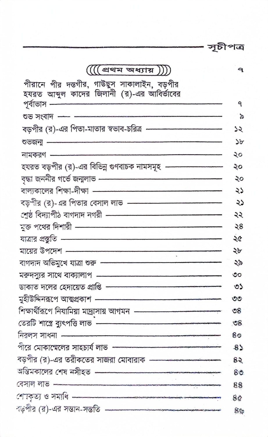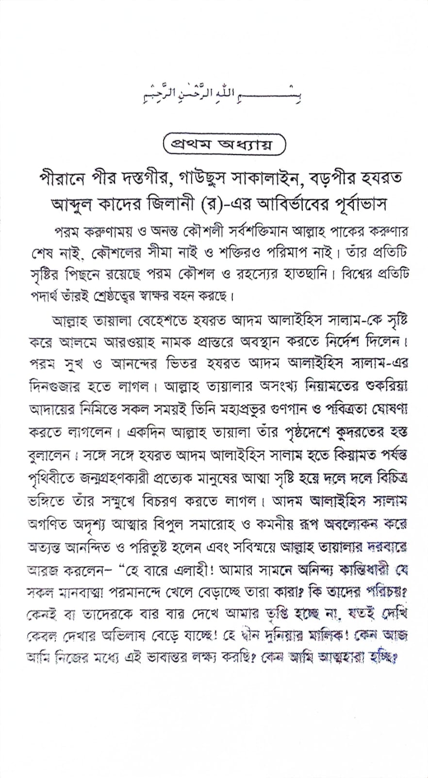 لهِ الرَّحْمنِ الرَّحِيمِপ্রথম অধ্যায়পীরানে পীর দস্তগীর, গাউছুস সাকালাইন, বড়পীর হযরত আব্দুল কাদের জিলানী (র)-এর আবির্ভাবের পূর্বাভাসপরম করুণাময় ও অনন্ত কৌশলী সর্বশক্তিমান আল্লাহ্ পাকের করুণার শেষ নাই, কৌশলের সীমা নাই ও শক্তিরও পরিমাপ নাই। তাঁর প্রতিটি সৃষ্টির পিছনে রয়েছে পরম কৌশল ও রহস্যের হাতছানি। বিশ্বের প্রতিটি পদার্থ তাঁরই শ্রেষ্ঠত্রে স্বাক্ষর বহন করছে।আল্লাহ তায়ালা বেহেশতে হযরত আদম আলাইহিস সালাম-কে সৃষ্টি করে আলমে আরওয়াহ নামক প্রান্তরে অবস্থান করতে নির্দেশ দিলেন 8 পরম সুখ ও আনন্দের ভিতর হযরত আদম আলাইহিস সালাম-এর দিনগুজার হতে লাগল। আল্লাহ তায়ালার অসংখ্য নিয়ামতের শুকরিয়া আদায়ের নিমিত্তে সকল সময়ই তিনি মহাপ্রভুর গুণগান ও পবিত্রতা ঘোষণা করতে লাগলেন। একদিন আল্লাহ তায়ালা তাঁর পৃষ্ঠদেশে কুদরতের হস্ত বুলালেন। সঙ্গে সঙ্গে হযরত আদম আলাইহিস সালাম হতে কিয়ামত পর্যন্ত পৃথিবীতে জন্মগ্রহণকারী প্রত্যেক মানুষের আত্মা সৃষ্টি হয়ে দলে দলে বিচিত্র ভঙ্গিতে তাঁর সম্মুখে বিচরণ করতে লাগল। আদম আলাইহিস সালাম অগণিত অদৃশ্য আত্মার বিপুল সমারোহ ও কমনীয় রূপ অবলোকন করে অত্যন্ত আনন্দিত ও পরিতুষ্ট হলেন এবং সবিস্ময়ে আল্লাহ তায়ালার দরবারে আরজ করলেন- “হে বারে এলাহী! আমার সামনে অনিন্দ্য কান্তিধারী যে সকল মানবাত্মা পরমানন্দে খেলে বেড়াচ্ছে তারা কারা? কি তাদের পরিচয়? কেনই বা তাদেরকে বার বার দেখে আমার তৃপ্তি হচ্ছে না, যতই দেখি কেবল দেখার অভিলাষ বেড়ে যাচ্ছে! দে দ্বীন দুনিয়ার মালিক! কেন আজ আমি নিজের মধ্যে এই ভাবান্তর লক্ষ্য করছি? কেন আমি আত্মহারা হি