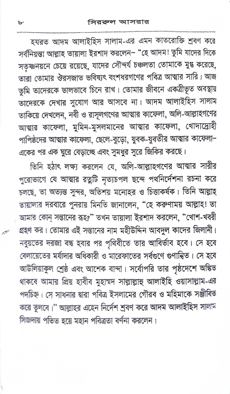 সিররুল আসরারহযরত আদম আলাইহিস সালাম-এর এমন কাতরোক্তি শ্রবণ করে সর্বনিয়া আল্লাহ তায়ালা ইরশাদ করলেন- “হে আদম! তুমি যাদের দিকে সতৃষ্ণনয়নে চেয়ে রয়েছে, যাদের সৌন্দর্য চঞ্চলতা তোমাকে মুগ্ধ করেছে, তারা তোমার ঔরসজাত ভবিষ্যৎ বংশধরগণের পবিত্র আত্মার সারি । আজ তুমি তাদেরকে ভালভাবে চিনে রাখ। তোমার জীবনে একত্রীভূত অবস্থায় তাদেরকে দেখার সুযোগ আর আসবে না। আদম আলাইহিস সালাম তাকিয়ে দেখলেন, নবী ও রাসূলগণের আত্মার কাফেলা, অলি-আল্লাহগণের আত্মার কাফেলা, মুমিন-মুসলমানের আত্মার কাফেলা, খোদাদ্রোহী পাপিষ্ঠদের আত্মার কাফেলা, ছেলে-বুড়ো, যুবক-যুবতীর আত্মার কাফেলা- একের পর এক ঘুরে বেড়াচ্ছে এবং সুমধুর সুরে জিকির করছে।তিনি হঠাৎ লক্ষ্য করলেন যে, অলি-আল্লাহগণের আত্মার সারীর পুরোভাগে যে আত্মার রত্নটি নৃত্যচপল ছন্দে পথনির্দেশনা রচনা করে চলছে, তা অত্যন্ত সুন্দর, অভিশয় মনোহর ও চিত্তাকর্ষক। তিনি আল্লাহ ডায়ালার দরবারে পুনরায় মিনতি জানালেন, “হে করুণাময় আল্লাহ! তা আমার কোন সন্তানের রূহ?” তখন তায়ালা ইরশাদ করলেন, “খোশ-খবরী গ্রহণ কর । তোমার এই সন্তানের নাম মহীউদ্দিন আবদুল কাদের জিলানী নবুয়তের দরজা বন্ধ হবার পর পৃথিবীতে তার আবির্ভাব হবে। সে হবে বেলারেডের মর্যাদার অধিকারী ও মারেফাতের সর্বগুণে গুণান্বিত। সে হবে আউলিয়াকুল শ্রেষ্ঠ এবং আশেক বান্দা। সর্বোপরি তার পৃষ্ঠদেশে অঙ্কিত থাকবে আমার প্রিয় হাবীব মুহাম্মদ সাল্লাল্লাহু আলাইহি ওয়াসাল্লাম-এর পদচিহ্ন। সে সাধনার দ্বারা পবিত্র ইসলামের গৌরব ও মহিমাকে সঞ্জীবিত করে ভুলবে।" আল্লাহর এহেন নির্দেশ শ্রবণ করে আদম আলাইহিস সালাম সিজদায় পতিত হয়ে মহান পবিত্রতা বর্ণনা করলেন ।