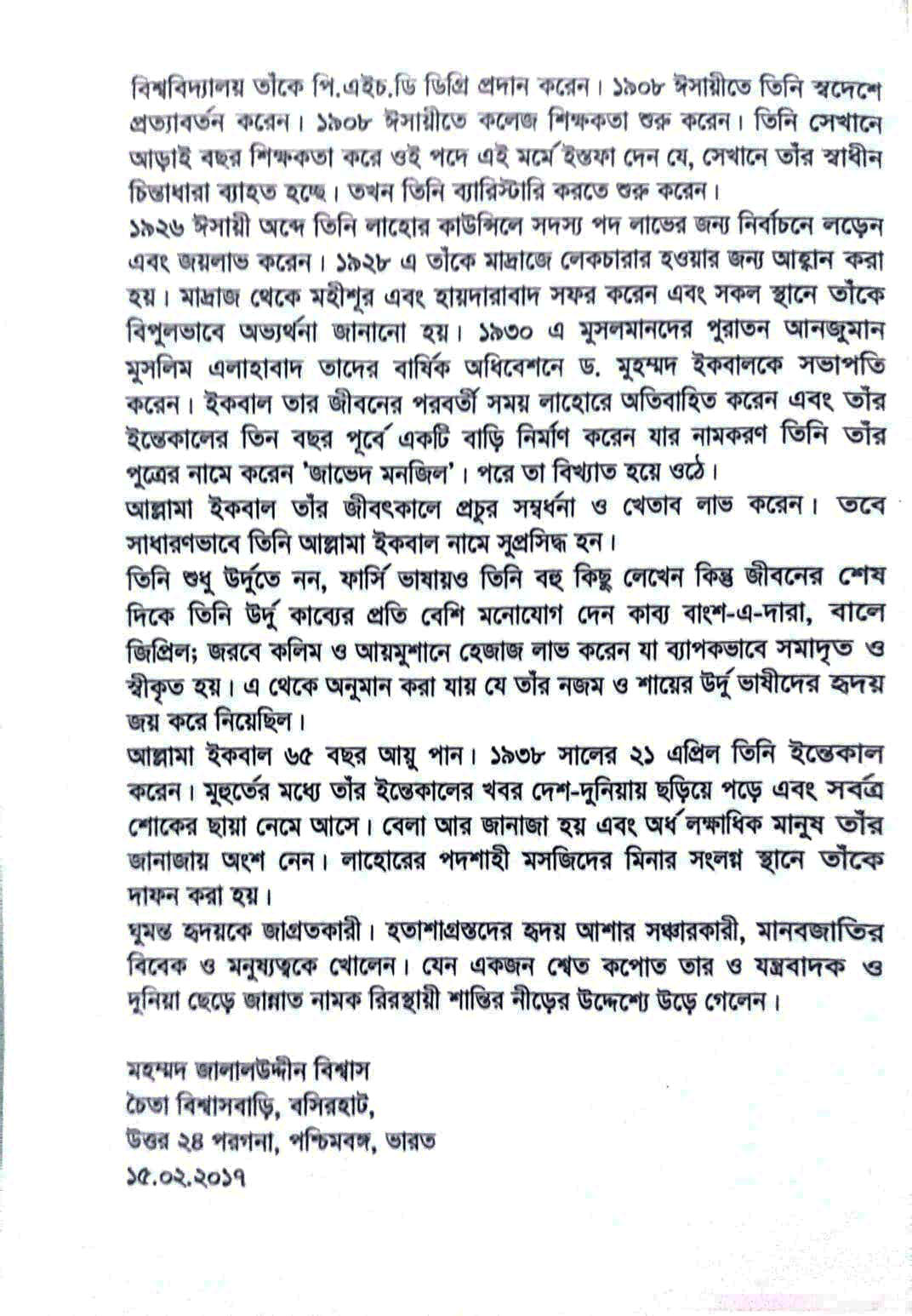 জয় করে নিয়েছিল। আল্লামা ইকবাল ৬৫ বছর আয়ু পান। ১৯৩৮ সালের ২১ এপ্রিল তিনি ইন্তেকাল করেন। মুহুর্তের মধ্যে তাঁর ইন্তেকালের খবর দেশ-দুনিয়ায় ছড়িয়ে পড়ে এবং সর্বত্র শোকের ছায়া নেমে আসে। বেলা আর জানাজা হয় এবং অর্ধ লক্ষাধিক মানুষ তাঁর জানাজায় অংশ নেন। লাহোরের পদশাহী মসজিদের মিনার সংলগ্ন স্থানে তাঁকে দাফন করা হয়।